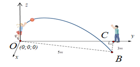 Hai đứa trẻ đang chơi với một quả bóng. Bé gái ném quả bóng cho bé trai. Quả bóng di chuyển uốn cong trong không khí, rơi xuống vị trí cách bé trai 3 m và cách bé gái 5 m (xem hình bên dưới). Biết mặt phẳng chứa quỹ đạo của quả bóng vuông góc với mặt đất, chọn hệ trục toạ độ như hình vẽ. Viết phương trình tổng quát của mặt phẳng chứa quỹ đạo của quả bóng?